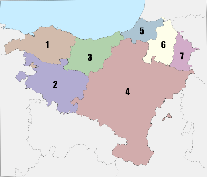 El territorio en el que viven los vascos ha cambiado de tamaño, forma y estructura política a lo largo de los siglos transcurridos desde su llegada – o, más exactamente, desde la llegada de los que les rodean; los vascos llevan en la región supuestamente desde la edad de piedra (cf. Juaristi 2013: 36). En la actualidad, la región administrativa está formada por las tres provincias de Vizcaya (№ 1 en la ilustración), Álava (2), y Guipúzcoa (3), aunque hay un número de nacionalistas que consideran Navarra (4) como una cuarta provincia. Esta ‘parte española’ se conoce como Hegoalde y es la contrapartida de Iparralde, la parte que se encuentra al otro lado de la frontera hispanofrancesa. Este parte vascofrancés está constituido por las tres provincias de Labort (5), Baja Navarra (6) y Sola (7).